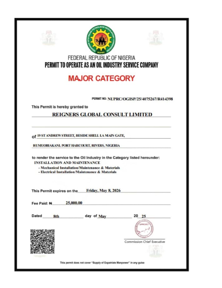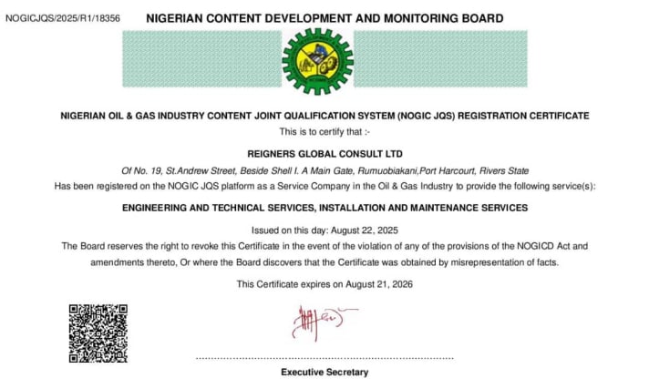 Reigners Global Consult Limited was registered in 2017 as a wholly indigenous company engaged in consultancy services across all sectors in Nigeria providing complete technical solutions required for the execution of various projects ranging from but not limited to Engineering Consultancy, Management Consultancy and Manpower Supply Services, Haulage & Logistics Services, Procurement Services, Environmental and Waste Management Services, Bid & Tendering Management, Regulatory & Compliance Consultancy and Support Services.